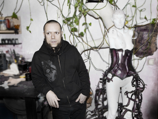 Here is me at my Studio in Berlin, where I work with sculpted leather, paint, wire, bones and other organic materials including people.